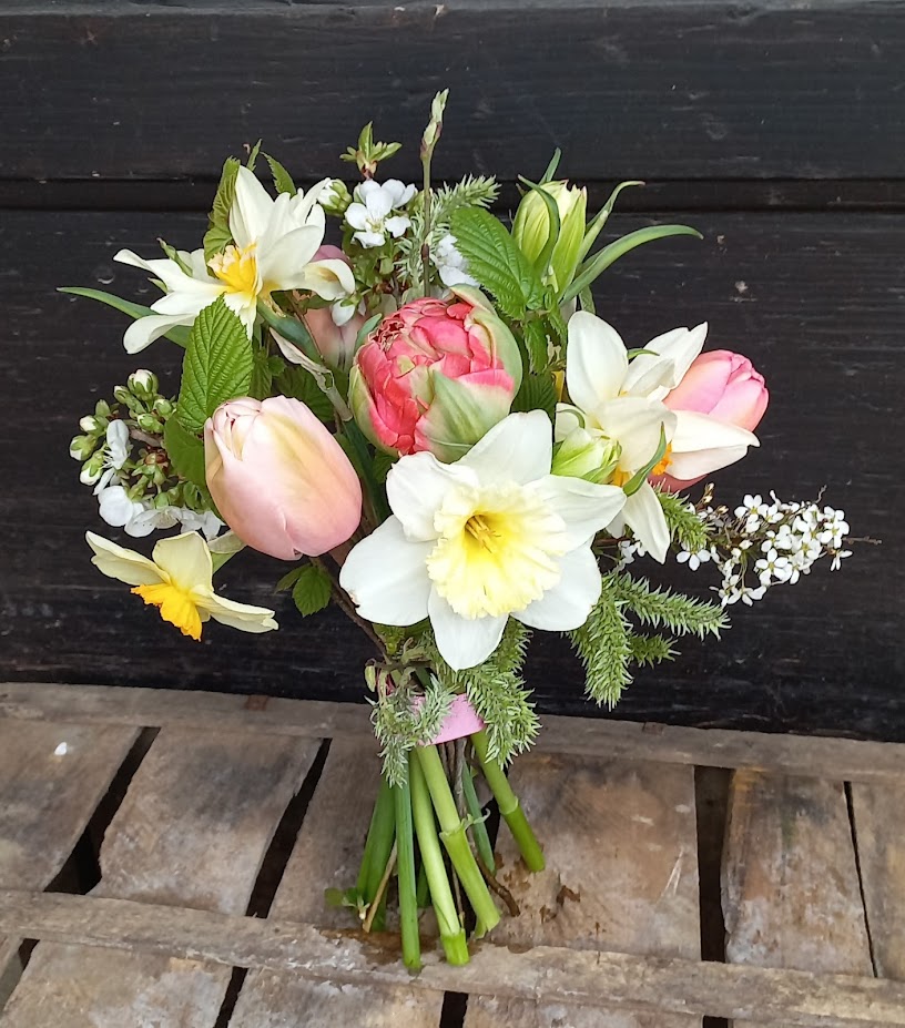 Jarní kytice střední je složena ze 7 tulipánů, narcisů nebo pryskyřníků a zeleně. Foto je pouze ilustrační.